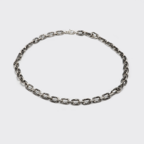 The Ash Chain Necklace strikes the perfect balance between rugged texture and refined craftsmanship. Each oval link is intricately detailed with a distressed, almost weathered surface, evoking the raw beauty of forged metal while maintaining a polished, wearable elegance.
