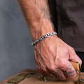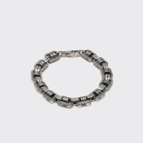 Engineered with precision and built to endure, the Mechanix bracelet takes its cues from the raw mechanics of industrial design. Each articulated link is forged with structural ridges and deep oxidized detailing—reminiscent of machine joints, gears, and tension systems.